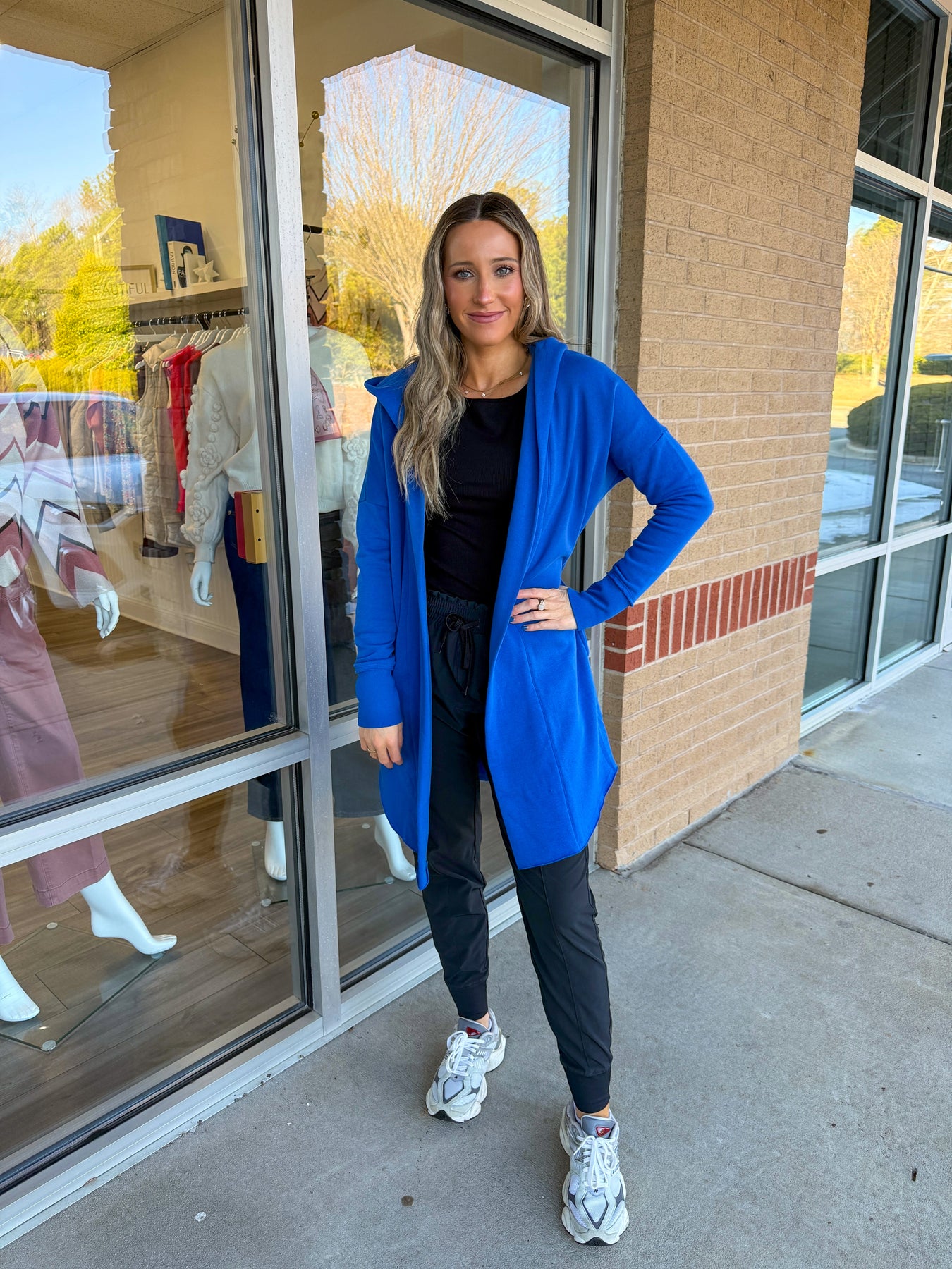 Layer up in style with this longline cardigan that's perfect for throwing over your favorite activewear. Crafted in a rich royal blue, it features a relaxed open front design and practical side pockets to keep your essentials close. Whether you're heading to the gym or grabbing coffee after class, this versatile piece adds an effortless cool-girl vibe to any outfit. The extended length provides extra coverage and movement, making it your new go-to for comfort that doesn't compromise on looks.